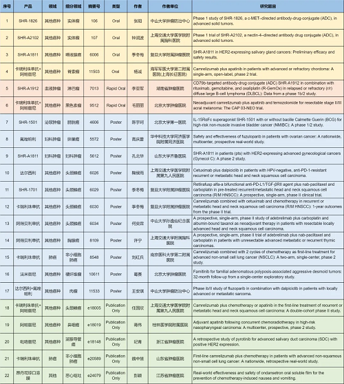 在肺癌、妇科肿瘤、淋巴瘤、膀胱癌、头颈肿瘤、黑色素瘤、肉瘤、鼻咽癌、脊索瘤、唾液腺癌、胸腺癌、硬纤维瘤、涎腺导管癌等其他多个疾病领域,卡瑞利珠单抗、阿帕替尼、阿得贝利单抗、吡咯替尼、达尔西利、氟唑帕利、法米替尼、SHR-1501、瑞拉芙普-α(SHR-1701)、SHR-1826、瑞康曲妥珠单抗(SHR-A1811)、SHR-A1912、SHR-A2102等抗肿瘤创新药相关研究一共入选了4项口头报告、2项快速口头报告、11项壁报展示和4项线上发表,彰显了金年会- 金字招牌医药强劲的研发实力。此外,昂丹司琼口溶膜在防治化疗导致的恶心呕吐方面展现出了良好的疗效,本次ASCO年会有1项研究线上发表。